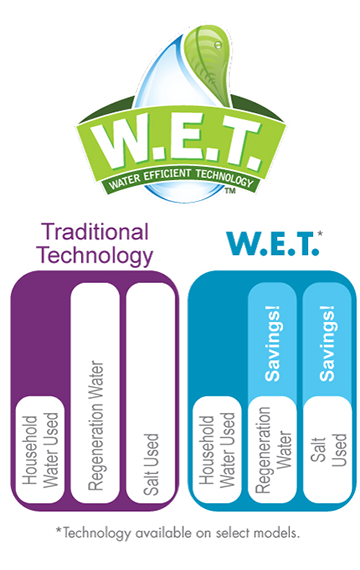 Because water is a precious resource, we are constantly looking for ways to use technology to conserve it. W.E.T, or Water Efficient Technology, allows a water softener to use only the amount of water and salt it needs to clean itself and nothing more. This unique feature and patented process is good for the environment, it’s cutting edge and it’s exclusively offered on the WaterCare Series water softener.